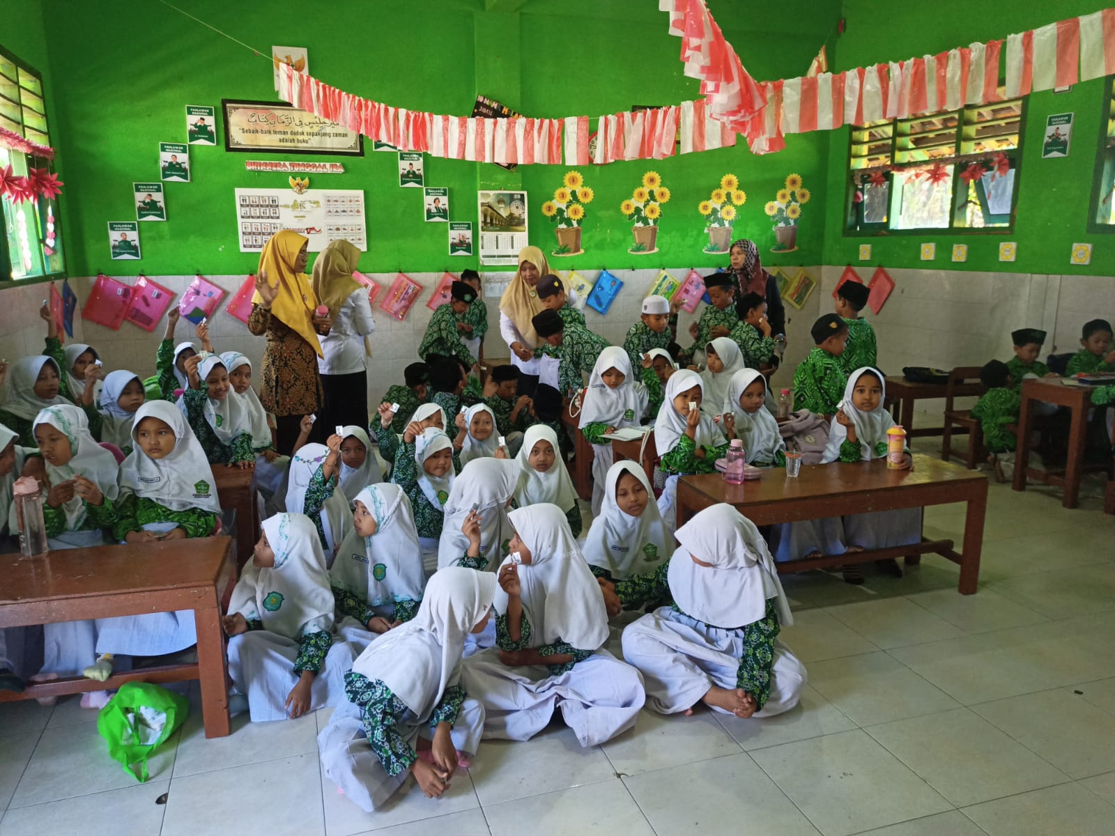 Suasana di MI Hidayatul Islamiyah tampak antusias. Guru-guru mendampingi para siswa dengan memberikan edukasi terlebih dahulu mengenai pentingnya menjaga kebersihan tangan dan lingkungan.